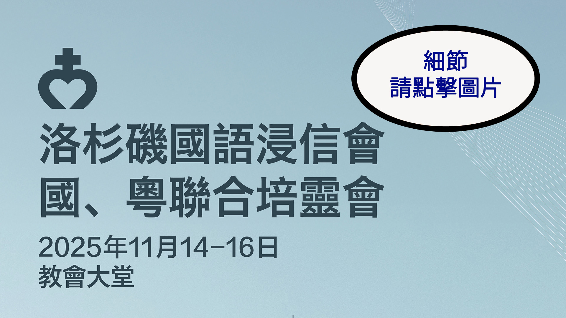 首頁 教會實體崇拜聚會粵語崇拜上午11:00 嘉惠堂禮堂 國語崇拜上午9:00及11:00 正堂禮堂 英語崇拜上午9:00 嘉惠堂禮堂 線上直播網址 media.mbcla.org 教會更新訊息... 粵語堂崇拜直播 崇拜程序, 最新訊息 音樂與崇拜 訓練信徒傳福音 主日學課程 週三線上禱告會 教會崇拜, 其他直播 兒童事工 教會圖書館 康樂委員會 教會會員登記 網上奉獻